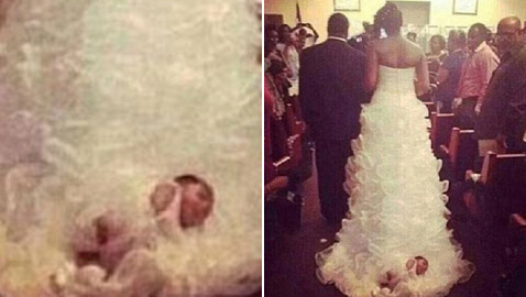 عروس أمريكية تجُر رضيعتها على ذيل فستانها طوال مراسم ..
